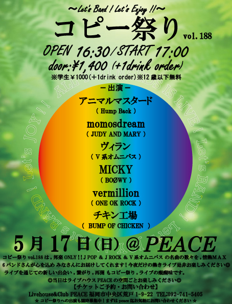 | Hall Side🎸一期一会式 PEACE Freestyle Jam Session 【 JAM PEACE 】 ~ 自由に夢中に音を求めて ~🎸毎週火曜開催🎷 Hall Side🎸一期一会式 PEACE Freestyle Jam Session 【 JAM PEACE 】 ~ 自由に夢中に音を求めて ~🎸毎週火曜開催🎷 3月 24 終日 ![]() Peaceオープン当初より続くPEACEフリーセッションデイ。 世界の名曲からその場で生まれるPEACE JAM SESSIONを★毎週火曜★に開催しています! 初心者から手練れまでどなたでも無料で参加・観覧が可能です。 ◎皆様のご来場をお待ちしています◎ -以下詳細- 🎸毎週火曜開催🎷 一期一会式 PEACE Freestyle Jam Session 【 JAM PEACE 】 ~ 自由に夢中に音を求めて ~ OPEN/START 20:00 close 24:00 参加・入場・観覧 無料! (要 1drinkn order) @Peace Hall側 福岡市中央区荒戸1-9-22 お問い合わせ: 092-741-5405 peace_livehouse@yahoo.co.jp 【 Song List 】 Africa Ain’t no sunshine Autumn leafs All blues Apache Be Berimbau Billie Jean Black Orpheus Blues for shorty bill Blue bossa Bring it home to me Breezin Cantaloupe island Ceora Chicken Change the world Chameleon Cissy strut Comin’ home baby Come together Cold duck time Country Road Cross road Days of wine rose Europe Englishman in Newyork Everybody loves sunshine Fall in Love Feel […] | 【Napari Chill a.k.a I L L I】Chill Chill Napari Chill -BAR side- 【Napari Chill a.k.a I L L I】Chill Chill Napari Chill -BAR side- 3月 27 終日 Chill Chill Napari Chill -BAR side- 【Napari Chill a.k.a I L L I】 OPEN 20:00 Door ¥1500(+1drink order ) 【出演】 ▶Napari Chill a.k.a I L L I 他 | ★☆ コピー祭り ☆★ vol.186 〜Let’s Band ! Let’s Enjoy !!〜 ★☆ コピー祭り ☆★ vol.186 〜Let’s Band ! Let’s Enjoy !!〜 3月 29 終日 ![]() 【 3/29日曜 】 ★☆ コピー祭り ☆★ vol.186 〜Let’s Band! Let’s Enjoy !!〜 open 16:30 / start 17:00 door:¥1,400(+1ドリンクオーダー¥600) ※学生¥1,000(+1drink order¥600) ※12歳未満無料 @livehouse&club PEACE 福岡市中央区荒戸1-9-22 tel:092-741-5405 -出演- ◾️チータロイド(アニソン全般) ◾️茉莉花(懐メロカバー) ◾️ザ・フュージョン(Vaundy、ヨルシカ、レベッカ、他) ◾️HEY-SI’z (ZIGGY) ◾️CRAZY BEATS(THE BLUE HEARTS) ※計5組出演決定! ★☆ 情熱MAX!邦楽ONLY!!今回開催ご縁での、出演5バンドさんの熱き今夜だけのライブ! ライブを通じての出会い再開、コピー祭りでの繋がりなど、Peaceの空間毎、是非お楽しみくださいませ。 是非 皆様のご来場をお待ちしております ☆★ ※peaceコピー祭りへの出演バンドさん随時募集中!お気軽にお問い合わせお願いいたします☆ ※音楽が好きな方であれば、技術、国籍、ジャンルなど問わず。初ライブ、久しぶりのライブでもこの機会に是非ともご参加くださいませ☆彡 まずはホームページor電話、メールにてお気軽にお問い合わせください! 次のステージはあなたの出番だ☆ | ||||